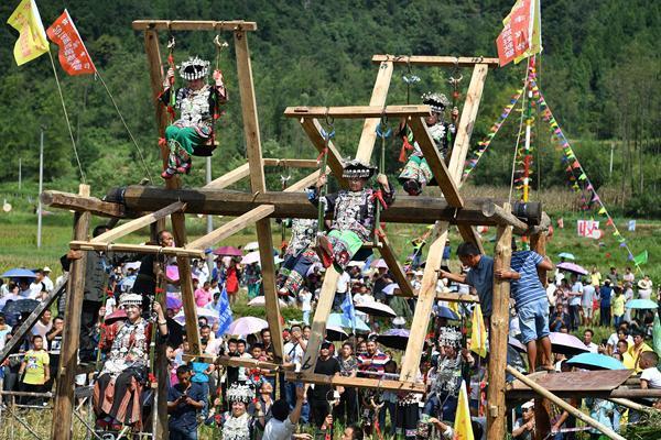 9月20日,在湖南省花垣县龙潭镇青龙村,苗族同胞在坐“八人秋”。