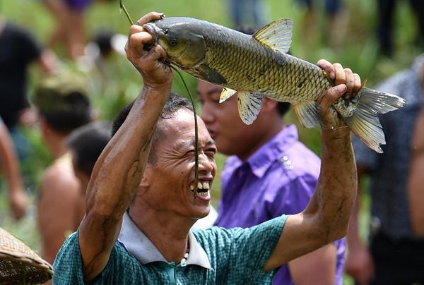 9月20日,在湖南省花垣县龙潭镇青龙村,一名男子展示自己抓的稻田鱼。