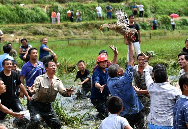 9月20日,在湖南省花垣县龙潭镇青龙村,人们在抢鸭子。