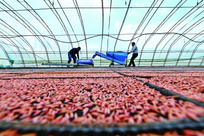 在黑龙江省双鸭山市一水稻育秧大棚里,农业职工在进行播种后的覆土作业。新华社发