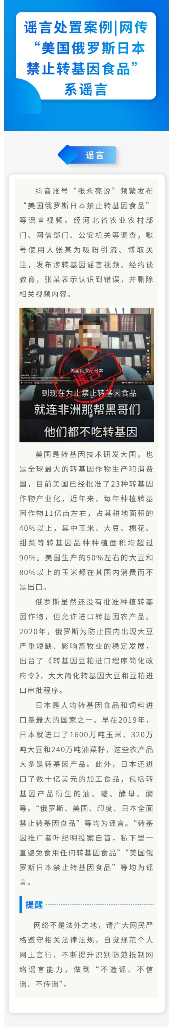 谣言处置案例丨网传“美国俄罗斯日本禁止转基因食品”系谣言