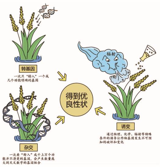 无论是杂交、诱变还是转基因,想得到我们预期的优良性状,都需要去改变作物的基因。杂交一次要“转入”成千上万个功能并不清楚的基因,会产生数量庞大到天文数字的基因组合;诱变则是通过物理、化学、辐射等特殊条件的诱导让作物基因发生不可预知的破坏和变化,既可能有我们需要的变化,也可能没有我们需要的变化,更可能有很多我们不需要的变化,转基因一次只“转入”一个或几个功能明确的基因。