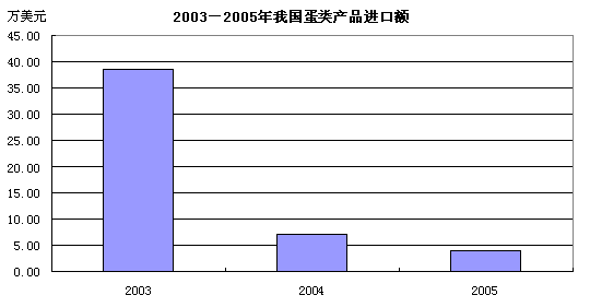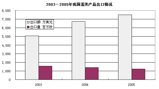 2005年,我国蛋产品出口量为12.15亿枚,同比减少了13.02%;出口额为7510.31万美元,同比增加了11.69%。我国蛋产品进口量为9621枚,同比增加了5.15%;进口额为3.99万美元,同比减少了43.37%。