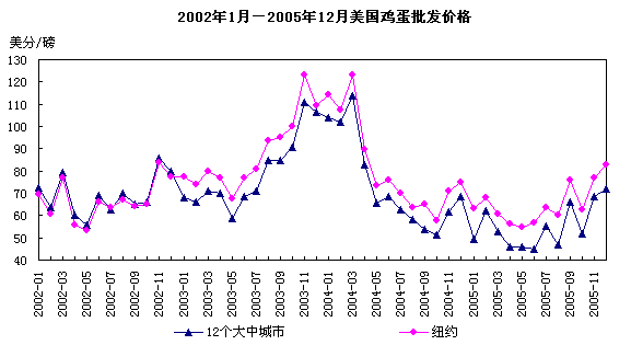 从美国情况来看,2005年12个大中城市鸡蛋平均价格为55.10美分/磅,与去年同期相比下降了25.97%。纽约鸡蛋平均价格为65.17美分/磅,与去年同期相比下降了20.71%。第四季度12个大中城市鸡蛋平均价格为64.03美分/磅,与去年同期相比提高了5.79%;与第三季度相比提高了13.93%。纽约鸡蛋平均价格为74.20美分/磅,与去年同期相比提高了9.07%;与第三季度相比提高了11.36%。从感恩节到圣诞节,蛋类需求不断加大,再加上许多地区遭受严寒和大雪天气,人们对蛋类的需求就更大,致使鸡蛋价格上涨。