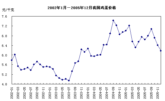 2005年,我国鸡蛋价格总体上呈现“降升降”的趋势。2~4月,母鸡产蛋旺季,鸡蛋供给增加;消费趋于平稳,且饲料价格稳中有降,这些因素使得鸡蛋价格下降。6月份以后,进入夏季,母鸡产蛋率下降,供给受到影响,鸡蛋价格上涨。10月份以后,受禽流感影响,鸡蛋市场需求持续低迷,鸡蛋价格下降。