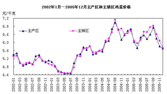 从主产区来看,2005年我国鸡蛋主产省(包括山东、河北、河南、江苏、辽宁、安徽、四川和湖北)鸡蛋平均价格为6.22元/千克,与去年相比上涨了2.58%;除四川下降了0.87%,其他省份均上涨,其中湖北涨幅最大,为8.27%。第四季度,鸡蛋平均价格为5.91元/千克,同比下降了7.60%;与第三季度相比,主产区鸡蛋平均价格下降了8.35%。