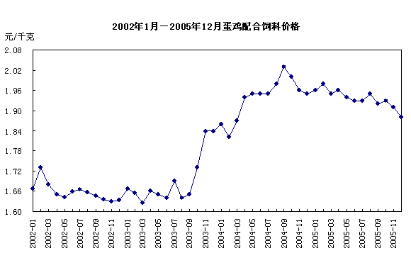 2005年,全国蛋鸡配合饲料平均价格为1.94元/千克,与去年相比下降了0.09%。第四季度,全国蛋鸡配合饲料平均价格为1.91元/千克,与去年同期相比下降了3.21%;与第三季度相比下降了1.38%。