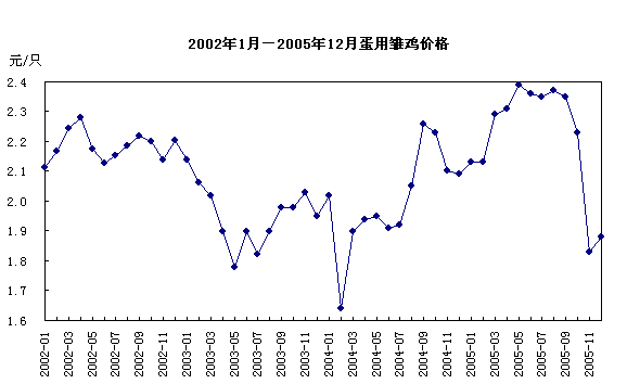2005年,全国蛋雏鸡平均价格为2.22元/只,与去年相比上涨了10.87%。第四季度,全国蛋雏鸡平均价格为1.98元/只,与去年同期相比下降了7.48%;与第三季度相比,价格下降了15.98%。