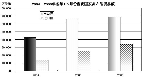 2006年1-9月份,活家禽(种禽除外)出口量为1354.68万只,同比减少26.64%;出口额为2180.65万美元,同比减少21.69%。