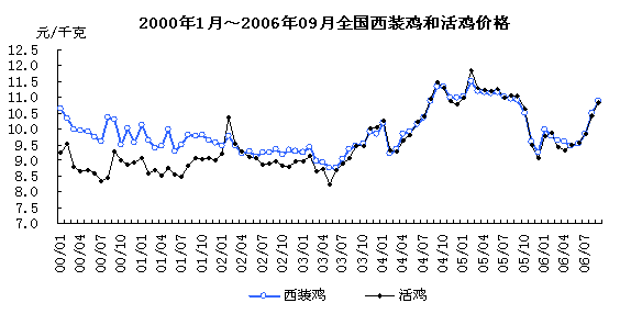 2006年1-9月份全国西装鸡平均价格为9.90元/千克,与去年同期比下跌了10.85%。第三季度平均价格为10.40元/千克,与上季度比上涨了9.21%,与去年同期比下跌了5.14%。虽然第三季度价格出现大幅上扬,但也难以弥补上半年的价格颓势。
