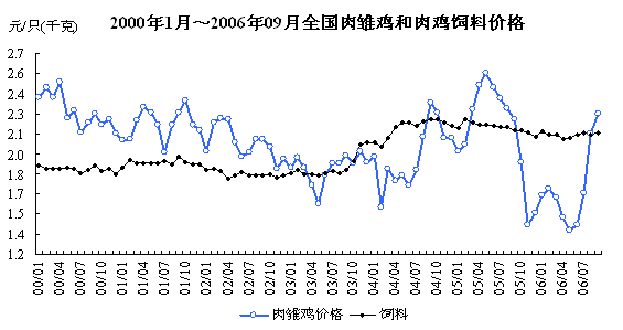 2006年1-9月份国内大部分地区禽肉价格同比偏低,5月份开始出现回升迹象,9月份达到全年的高点,预示着禽肉生产和消费低靡过后正逐步复苏。从雏鸡价格来看,也出现了触底后的强势反弹,生产者对预期形势看好,补栏积极性很高。预计第四季度家禽产品价格将继续回升。