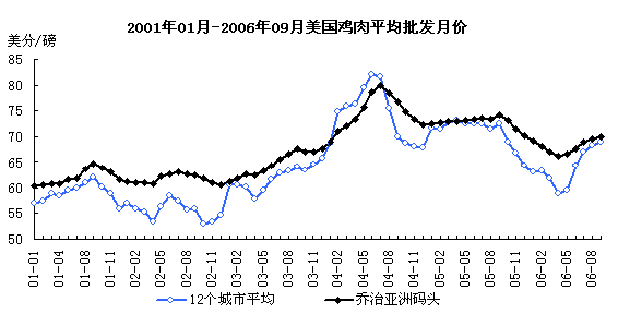 美国禽肉价格在持续下跌后出现大幅回升。自2005年9月以来,美国禽肉价格持续下跌,但从2006年4月开始价格出现反弹,涨势持续至9月底,预计价格还将上行至年底。2006年前三季度美国12个城市鸡肉平均价格为63.92美分/磅,与去年同期相比下跌了11.59%。前三季度乔治亚州码头鸡肉平均价格为68.18美分/磅,与去年同期比下跌了6.93%。美国禽肉价格下降主要是由于2005年底受禽流感影响出口严重受阻,导致库存增加,2006年上半年价格处于低位调整阶段,而下半年生产、出口增加,禽肉价格开始强势回升。