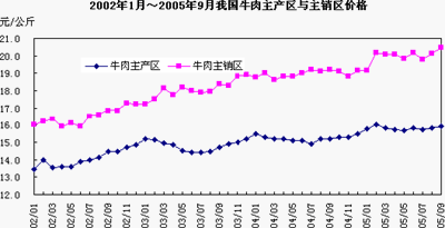 根据农业部畜牧兽医局定点调查月报资料分析,2005年前三季度我国牛肉平均价格为17.55元/公斤,与上年同期相比提高7.27%。其中,第三季度平均价格为17.50元/公斤,与第二季度基本持平,与上年同期相比提高5.80%。从全国各省区看,与上年前三季度相比,有27个省市牛肉价格上升。其中,有9个省市价格升幅超过10%。