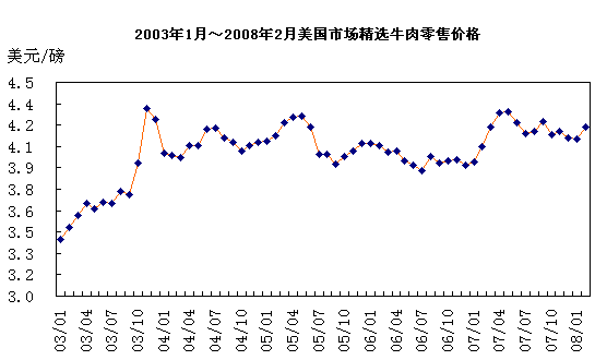 美国:美国牛肉价格与前几个月相比小幅上涨。在零售价格方面,1月精选牛肉价格为每磅4.10美元,同比提高1.46%。2月价格为每磅4.18美元,环比上涨1.95%,同比上涨3.21%。美国牛肉价格自2007年6月高位回落后,一直在较高价位波动。