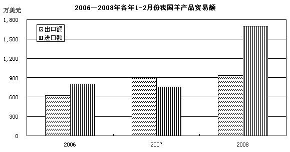 1-2月我国羊产品累计出口额为940.64万美元,同比增加4.68%;进口额为1700.45万美元,同比增加1.25倍。羊产品进口大于出口,从去年同期的贸易顺差变为贸易逆差。由于进口大幅度增加,贸易逆差达到759.81万美元。