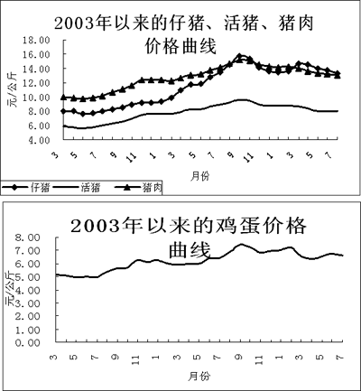 近期生猪产品价格仍将呈下跌趋势。近两年,生猪产品价格走势与历史规律有所不同。以往一般是一、四季度价格高,二、三季度低,并且从7月份开始逐渐上涨。近两年生猪产品价格的行情是,从2003年5月份开始连续17个月上涨,之后从去年10月份一路下跌,跌势已持续10个月,本月生猪产品价格首次呈现同比全面负增长。由于每月的降幅不大,生猪产品的价位仍处于较高水平。
