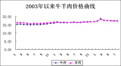 后期牛羊肉价格稳定的格局不会改变。近九年来,牛羊肉价格基本保持稳步上涨,今年2月份后才出现小幅下降。目前价位仍高于2004年以前的价格。1-7月,牛肉平均价格为17.56元,羊肉平均价格为17.59元,同比分别增长7.8%和6.9%。预计价格同比增长、环比小幅下降的格局短期内不会有大的变动。