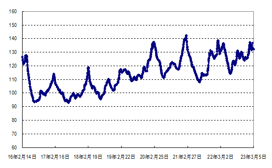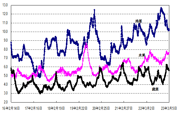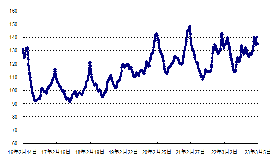 据农业农村部监测,2023年第9周(2023年2月27日—3月5日,下同)“农产品批发价格200指数”为132.42(以2015年为100),比前一周降0.36个点,同比高1.59个点;“‘菜篮子’产品批发价格200指数”为134.93(以2015年为100),比前一周降0.44个点,同比高1.29个点。