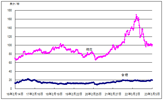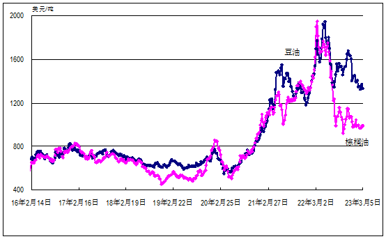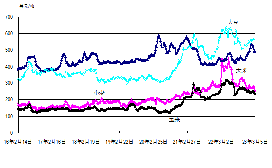 美国芝加哥商品交易所小麦、玉米、豆油和大豆最近期货合约收盘周均价每吨分别为256美元、235美元、1332美元和556美元,环比分别跌6%、4%、3%和2%,同比分别低38%、19%、21%和10%;泰国100%B级和5%破碎率大米曼谷离岸周均价每吨分别为486美元和472美元,环比均跌1%,同比均高12%。