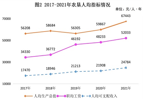 全年农垦经济实现生产总值[2]9267.86亿元(见图1),比上年增长11.9%。其中,第一产业增加值2162.87亿元;第二产业增加值3793.75亿元;第三产业增加值3311.24亿元。第一、第二、第三产业增加值占农垦生产总值的比重分别为23.4%、40.9%和35.7%。人均生产总值67443元,增长12.7%;人均可支配收入达到24784元,增长13.1%(见图2)。
