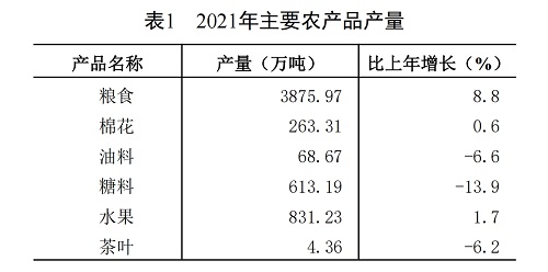 全年农作物播种面积6995.91千公顷,比上年增加145.16千公顷,增长2.1%。其中,粮食播种面积4990.39千公顷,增加182.58千公顷,增长3.8%;棉花面积1014.78千公顷,减少1.46千公顷,下降0.1%;油料面积276.51千公顷,减少30.33千公顷,下降9.9%;糖料面积81.66千公顷,减少13.33千公顷,下降14.0%。