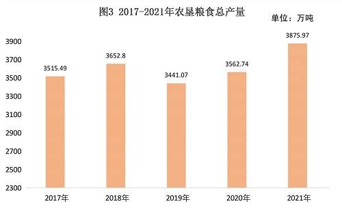 粮食总产量3875.97万吨,比上年增加313.23万吨,增长8.8%(见图3)。主要农产品产量见表1。