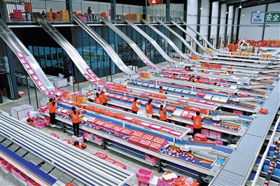 河南省灵宝市,一家果品企业的智能分拣包装车间内,工人借助智能分拣系统进行评级分拣。