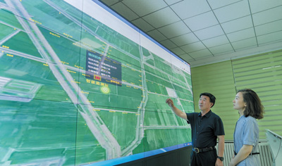 山东省邹平市明集镇,农业技术人员通过农业智慧平台查看“数字农田”监管和服务系统在农田的分布使用情况。