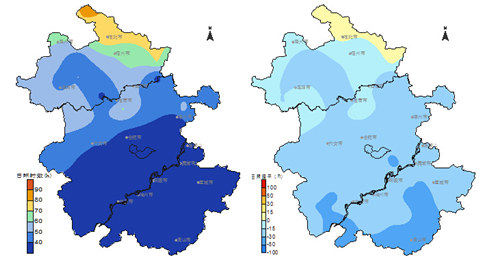 安徽省2015年6月上旬日照时数(左)及其距平(右)分布