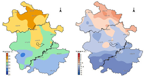安徽省2015年6月上旬平均气温(左)及其距平(右)分布