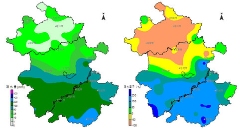 安徽省2015年6月上旬降水量(左)及其距平百分率(右)分布