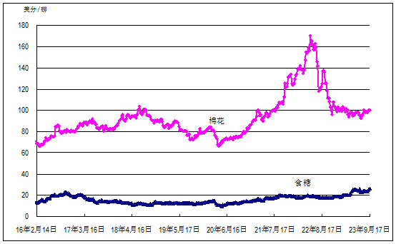 国际棉花指数(SM级)每磅99.88美分(每吨2202美元),环比基本持平,同比低21%;美国芝加哥商品交易所小麦最近期货合约收盘周均价每吨为210美元,环比基本持平,同比低33%。