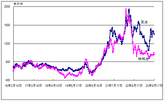 马来西亚棕榈油荷兰鹿特丹港到岸周均价每吨962美元,环比跌4%,同比低10%;泰国100%B级和5%破碎率大米曼谷离岸周均价每吨分别为643美元和629美元,环比均跌2%,同比分别高42%和43%;美国芝加哥商品交易所豆油、大豆和玉米最近期货合约收盘周均价每吨分别为1402美元、493美元和172美元,环比分别跌2%、1%和1%,同比分别低9%、11%和37%。