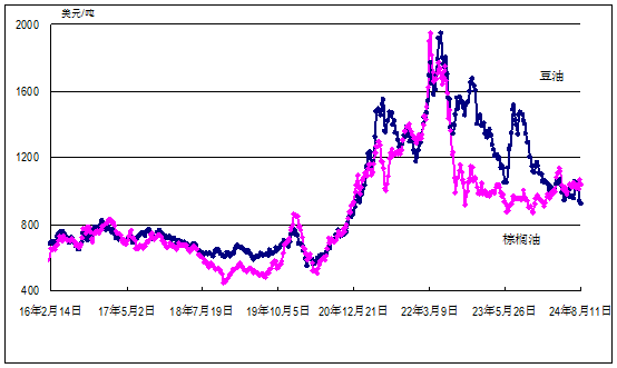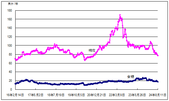 美国芝加哥商品交易所豆油、玉米和大豆最近期货合约收盘周均价每吨分别为925美元、141美元和376美元,环比分别跌2%、1%和1%,同比分别低37%、21%和28%;马来西亚棕榈油荷兰鹿特丹港到岸周均价每吨1039美元,环比跌2%,同比高10%;国际棉花价格指数(SM级)每磅77.31美分(每吨1704美元),环比跌1%,同比低21%;国际糖料理事会原糖周均价每磅18.12美分(每吨400美元),环比跌3%,同比低23%。
