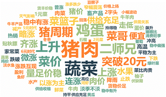 3.蔬菜均价连续7周上涨。受高温多雨天气影响,蔬菜价格继续上涨,重点监测的28种蔬菜周均价每公斤5.53元,环比涨8.6%,为连续7周上涨,累计涨幅28.3%,同比高12.4%。分品种看,27种蔬菜价格上涨,1种下跌。其中,莴笋价格涨幅较大,环比涨20.6%,菜花、大白菜、西红柿、黄瓜、豆角和韭菜价格环比分别涨19.6%、18.8%、18.0%、16.0%、15.3%和15.2%,其余品种价格涨幅在15%以内;莲藕价格环比跌3.0%。
