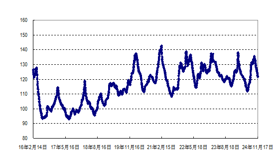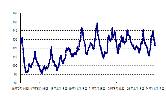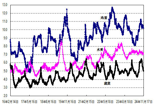 据农业农村部监测,2024年第46周(2024年11月11日—11月17日,下同)“农产品批发价格200指数”为122.32(以2015年为100),比前一周降2.14个点,同比高5.68个点;“‘菜篮子’产品批发价格指数”为123.65(以2015年为100),比前一周降2.50个点,同比高7.46个点。