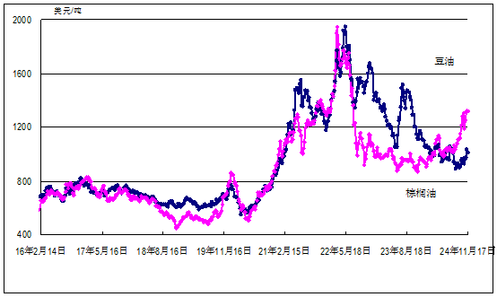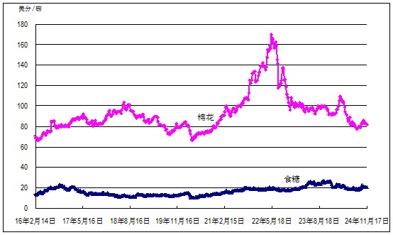 美国芝加哥商品交易所小麦和豆油最近期货合约收盘周均价每吨分别为200美元和1008美元,环比分别跌5%和2%,同比分别低3%和12%;国际糖料理事会原糖周均价每磅20.23美分(每吨446美元),环比跌2%,同比低22%;国际棉花价格指数(SM级)每磅81.73美分(每吨1802美元),环比跌1%,同比低11%。