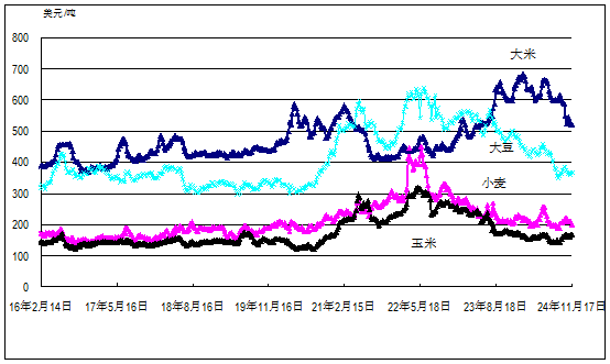 美国芝加哥商品交易所玉米和大豆最近期货合约收盘周均价每吨分别为167美元和367美元,环比均基本持平,同比分别低10%和27%;泰国100%B级和5%破碎率大米曼谷离岸周均价每吨分别为521美元和506美元,环比均基本持平,同比均低13%。