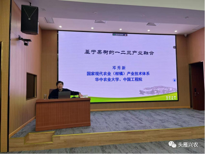 近日,中国工程院院士、国家现代农业(柑橘)产业技术体系首席科学家、华中农业大学教授邓秀新在学校教育培训学院6号会议室作了题为“基于果树的一二三产业融合”专题讲座。江西、云南两省乡村产业振兴带头人“头雁”学员约150余人参加学习,并现场与邓秀新院士进行了交流互动。