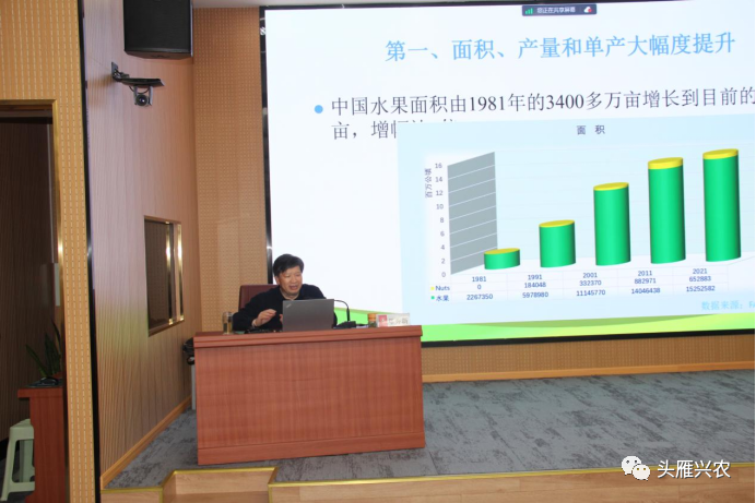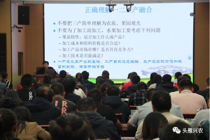 “三产并不能简单理解为农旅、果园观光,要正确的理解一二三产业融合。从果树行业来看,一产是水果产业的基础,二产目前还是短板,三产是实现价值和致富的关键,需要开拓掌控。”邓秀新院士从一二三产业划分在果业产业中的具体表现引入,并从我国果树产业基本情况、产业发展经验和误区,以及促进一二三产业融合建议三个方面开展了授课。